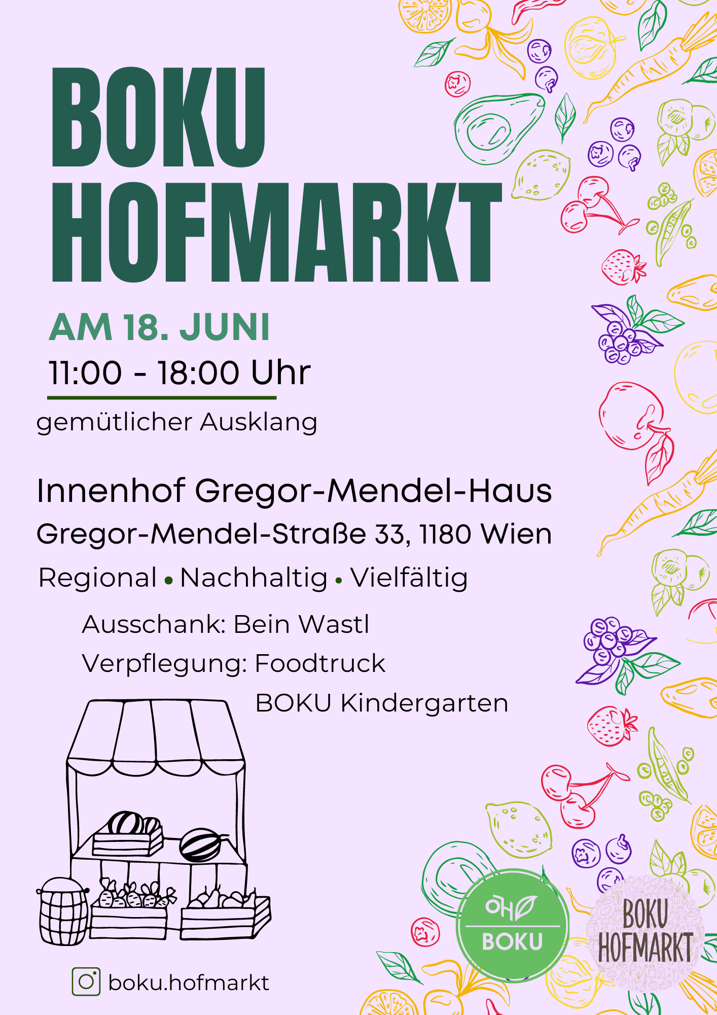 Die zweite Ausgabe des BOKU Hofmarktes ist da! Am 18. Juni könnt ihr im Innenhof des Gregor-Mendel-Hauses erneut regionale Köstlichkeiten und Produkte erwerben. Auch für Getränke und Speisen ist gesorgt! Besucht uns und genießt von 11 bis 18 Uhr die Marktatmosphäre bei musikalischer Begleitung.