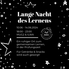 Um die stressige Lernphase gemeinsam zu bewältigen, organisiert das OrgRef wieder die Lange Nacht des Lernens. Dabei stellen wir euch die Standorte Ilse-Wallentin und Muthgasse zur Verfügung.