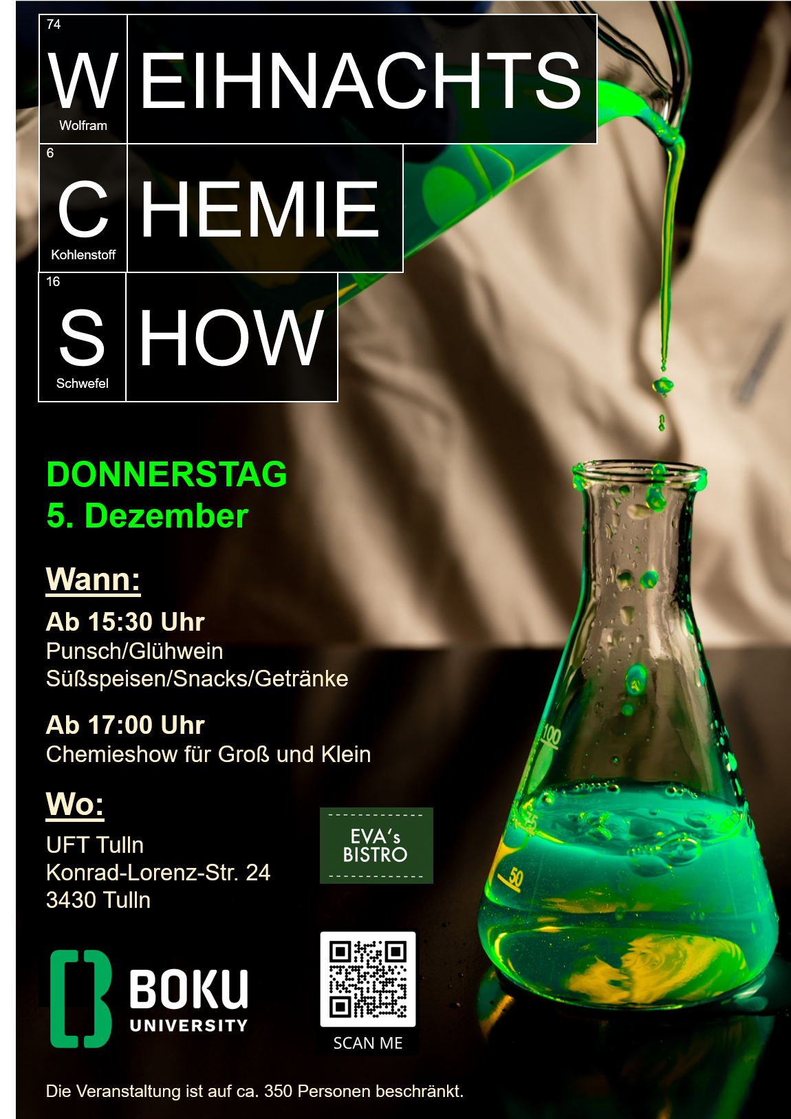 Das Department für Chemie und das Institut für Chemie nachwachsender Rohstoffe der BOKU laden am Donnerstag, den 5. Dezember wieder zu einer besonderen, wissenschaftshistorischen Veranstaltung und chemischen Experimentalshow für Jung und Alt am UFT Tulln ein.