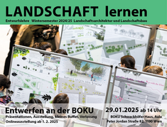 Die Studierenden des Instituts für Landschaftsarchitektur (ILA) und des Instituts für Ingenieurbiologie und Landschaftsbau (IBLB) der Universität für Bodenkultur Wien präsentieren ausgewählte Entwurfsarbeiten des Bachelor- und des Masterstudiums Landschaftsplanung und Landschaftsarchitektur. Der diesjährige Schwerpunkt liegt auf Vernetzung innerhalb des Curriculums sowie der Kooperation relevanter Lehrveranstaltungen.