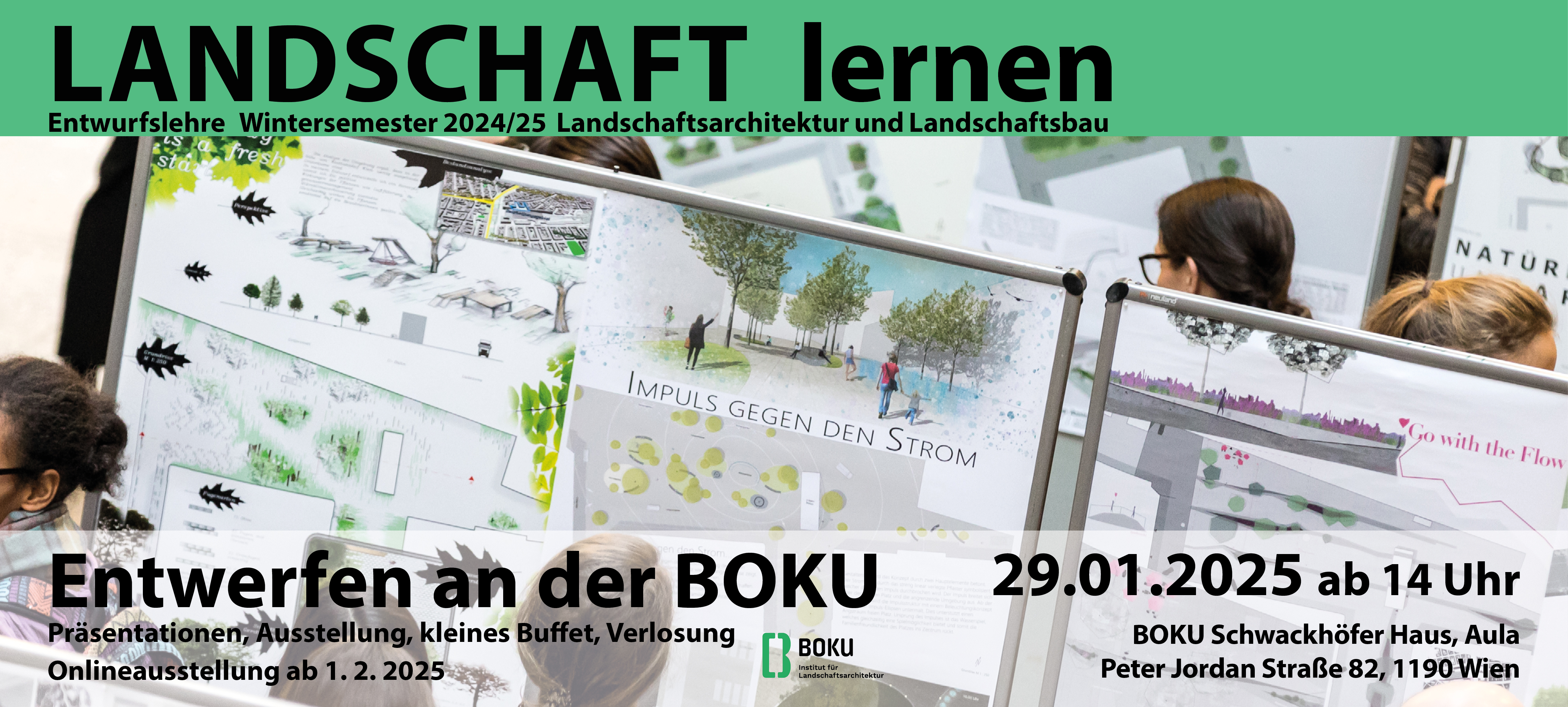 Studierende des Instituts für Landschaftsarchitektur und des Instituts für Ingenieurbiologie und Landschaftsbau der Universität für Bodenkultur präsentieren ausgewählte Entwurfsarbeiten. Die Arbeiten bietet Einblicke in die Projekt- und Entwurfsarbeit des Bachelor- und des Masterstudiums Landschaftsplanung und Landschaftsarchitektur.