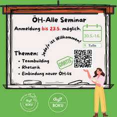 Das ÖH-Alle Seminar steht bevor. Wir werden das Wochenende vom 30.05-01.06 in Tulln verbringen (kostenlos, gemeinsame Anreise) Es ist eine tolle Chance neue Leute kennenzulernen und ÖH / Stv. Luft zu schnuppern.