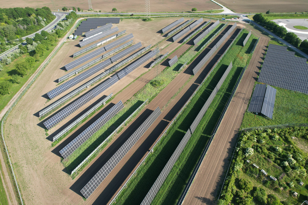 Im Rahmen des Forschungsprojekts „Muster- und Leuchtturmprojekt Photovoltaik – EWS Sonnenfeld“, gefördert vom Klima- und Energiefond, arbeiten das Institut für Landtechnik und das Institut für Pflanzenbau gemeinsam mit dem Energiepark Bruck/Leitha GmbH und der EWS Consulting GmbH an der Frage, welche Pflanzenkulturen und Bewirtschaftungsformen sich bei gleichzeitiger PV-Produktion am besten eignen. Das Projekt wird in der Forschungs- und Demonstrationsanlage in Bruck an der Leitha durchgeführt. Diese Pilotanlage hat eine Fläche von 5,5 ha, auf der nachgeführte Modultischreihen (Höhe 2,8 m bei horizontaler Ausrichtung) mit unterschiedlichen Achsabständen von 8, 11 und 14 m installiert wurden. Unter den PV-Modulen wurden 2 m breite Blühstreifen angelegt (siehe Abbildung). Daraus ergeben sich nutzbare landwirtschaftliche Breiten von 6, 9 sowie 12 m. Die Ergebnisse des Projektes werden genutzt, um optimale Abstandseinstellungen aus Sicht der landwirtschaftlichen Produktion als auch aus Sicht der Energieerzeugung zu ermitteln.