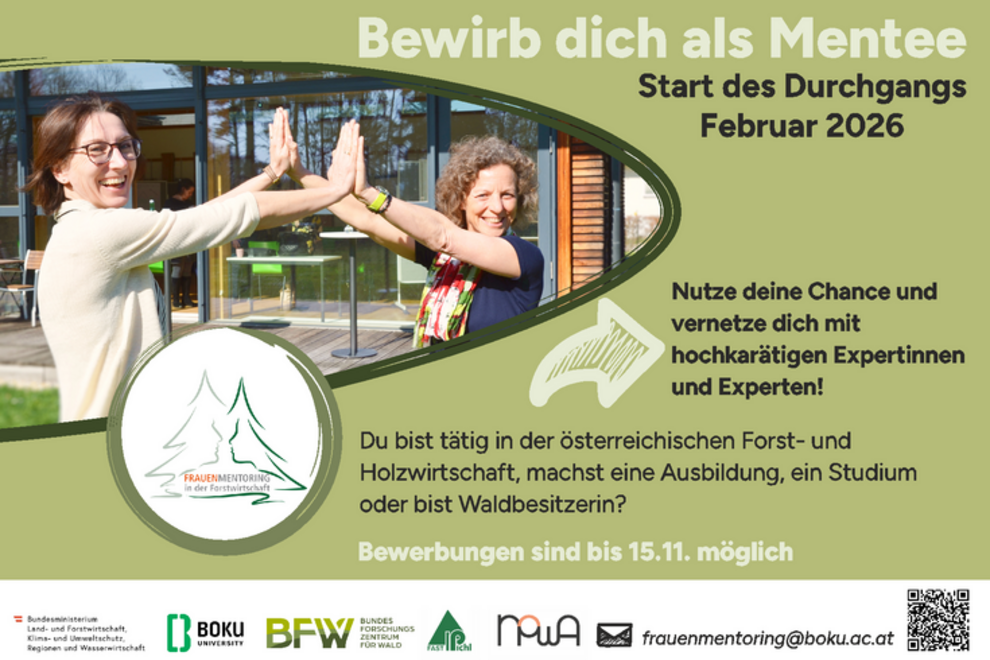 Bis 15.11.2025 laufen die Bewerbungen für das Mentoring-Programm 2026 für Frauen in der Forst- und Holzwirtschaft (Start des Durchgangs Februar 2026).
