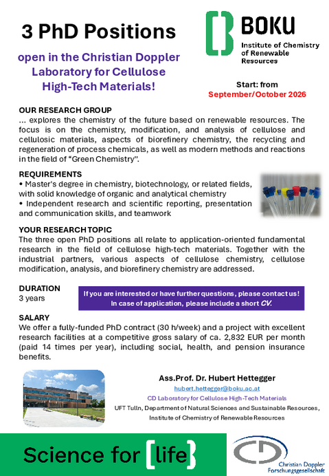 Offene Stellen BOKU-StartDepartment für Naturwissenschaften und Nachhaltige RessourcenInstitut für Chemie nachwachsender RohstoffeOffene Stellen Diese Seite ist erreichbar unter: https://boku.ac.at/nwnr/chnr/offene-stellen https://short.boku.ac.at/2xvv40 https://short.boku.ac.at/qko8rk Offene Stellen PhD Opportunity in the CD Laboratory for Cellulose High-Tech Materials Zum Download der Stellenausschreibung auf das Bild klicken Masterarbeit "Structure Profiling in Lignin by SEC" Zum Download der Stellenausschreibung auf das Bild klicken Masterarbeit "Rapid Analysis of Lignin by IR" Zum Download der Stellenausschreibung auf das Bild klicken!