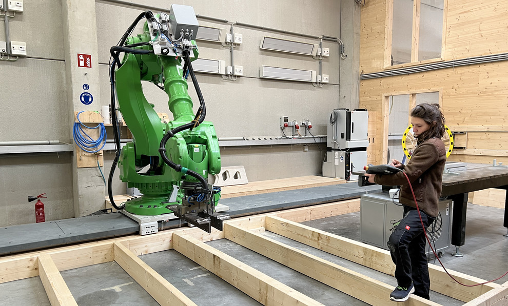 Die BOKU University forscht daher an seriell vorgefertigten Elementen aus nachwachsenden Rohstoffen als nachhaltige Alternative. Bislang werden Holzrahmenelemente überwiegend manuell geplant – unterstützt von digitalen Zeichenprogrammen – und nach wie vor von Hand gefertigt. Dieser aufwendige Prozess bindet viel Personal, das immer knapper wird.