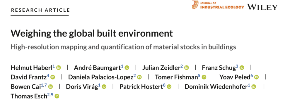 Haberl, H., Baumgart, A., Zeidler, J., et al. (2025). Weighing the Global Built Environment: High-resolution Mapping and Quantification of Material Stocks in Buildings.Journal of Industrial Ecology, 29, 159–172. https://doi.org/10.1111/jiec.13585