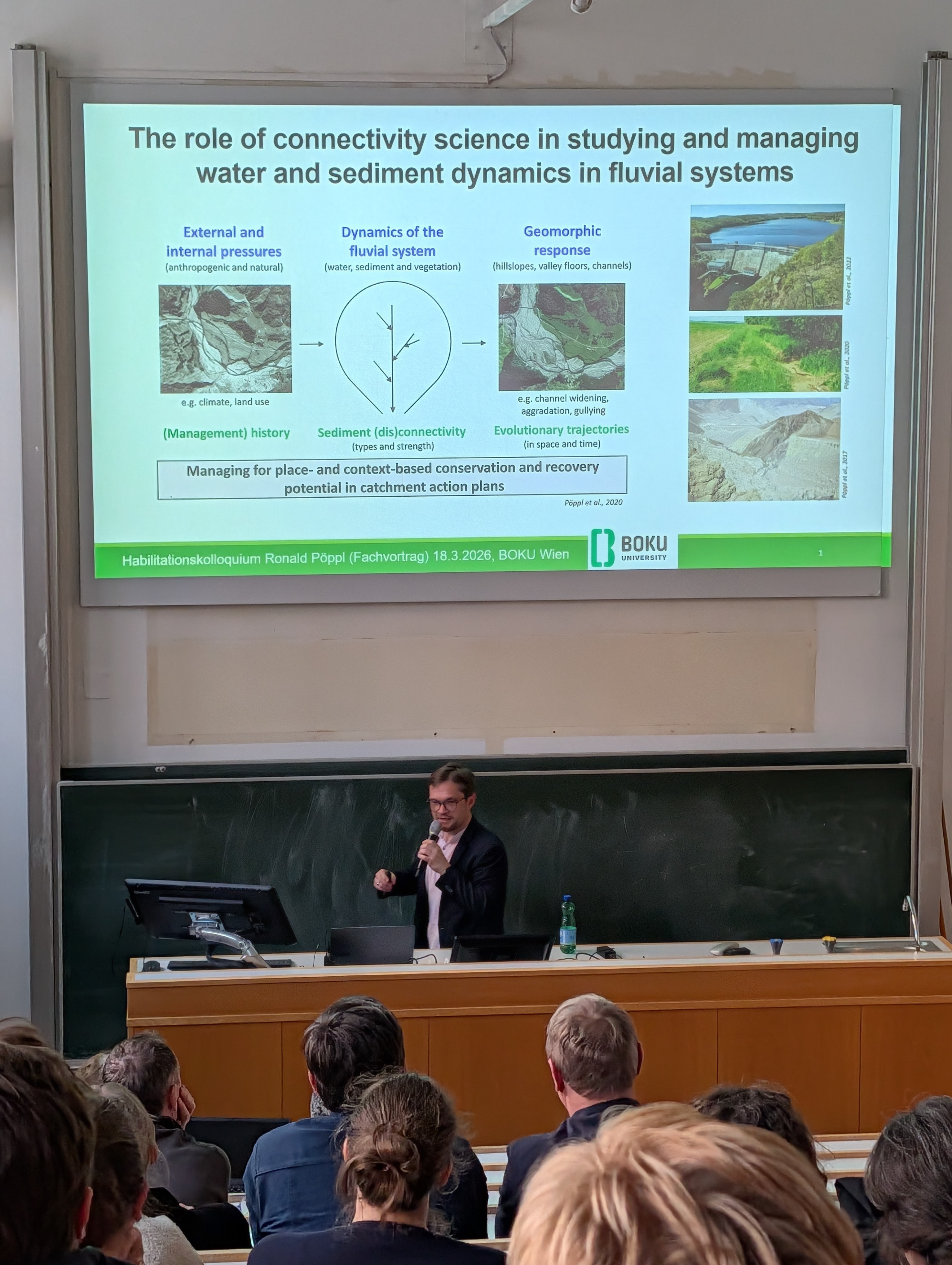 Mit seinem Fachvortrag „The role of connectivity science in studying and managing water and sediment dynamics in fluvial systems“ sowie dem Lehrvortrag „Konzept der Konnektivität in der physischen Geographie und der Hydrobiologie“ konnte er das Publikum und die Kommission vollends überzeugen.
