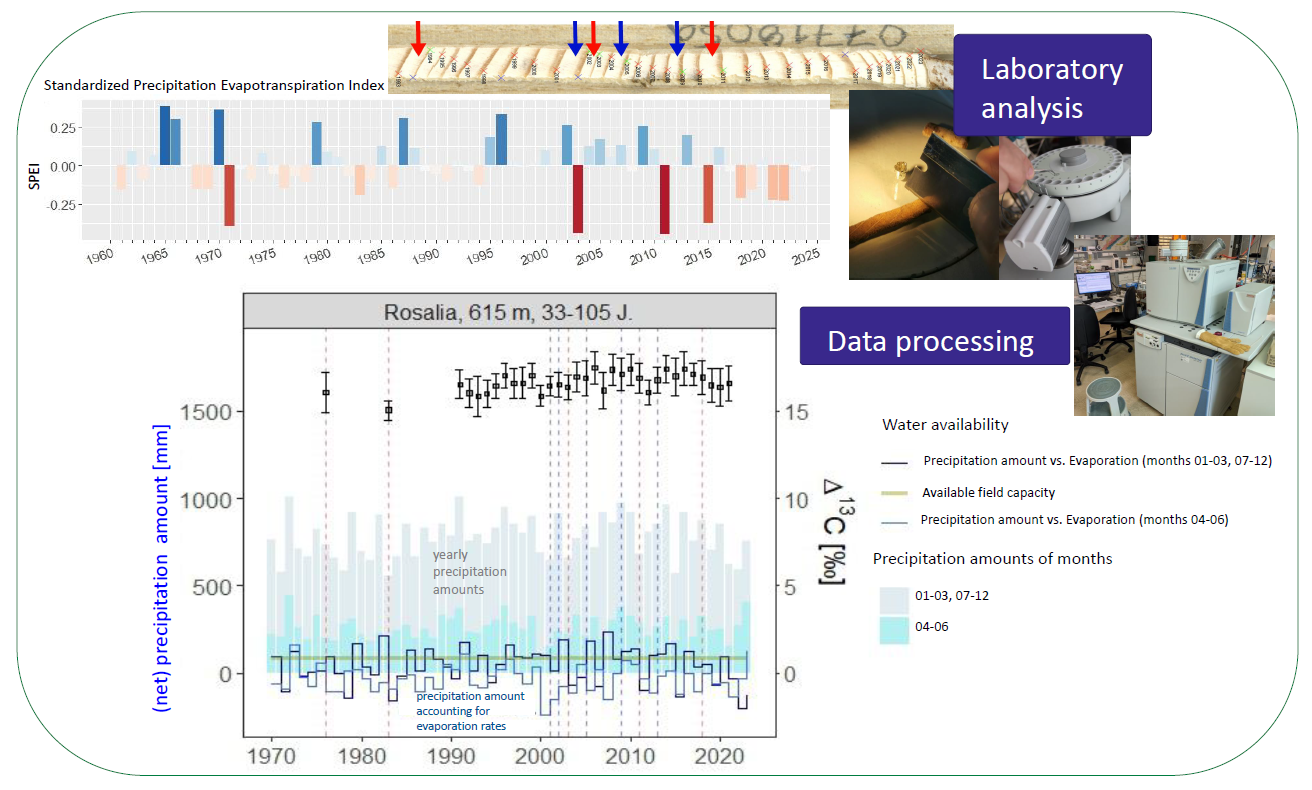 Die Fichte ist die wirtschaftlich relevanteste und häufigste Baumart in österreichischen Wäldern. Aufgrund ihrer flachen Wurzeln ist für sie die Wasserverfügbarkeit limitiert, sodass Trockenheit und hohe Temperaturen Trockenstress und ihr Risiko für Borkenkäferbefall besonders begünstigen. Signaturen stabiler Isotope (13C, 18O) in Jahrringen liefern detaillierte Informationen über vergangene Klimaschwankungen sowie über physiologische Reaktionen eines Baumes auf Umwelt- und geomorphologische Bedingungen (z.B. Verfügbarkeit und Nutzung von Bodenwasser). Dieses Wissen kann unser Verständnis zu bisherigen sowie zukünftigen Auswirkungen des Klimawandels (Temperaturanstieg, veränderte Niederschlagsmuster: extreme Sommertrockenheit, geringe Schneemengen, …) bedeutend verbessern. Durch Messung der Baumring-Isotopenchronologie nachgewiesener Trockenstress kann eine gute Möglichkeit zur Vorhersage für die Anfälligkeit für späteren Borkenkäferbefall sein. Solche Informationen bieten die Grundlage für die Erstellung von Dürre- und Borkenkäfer-Risikokarten, die verknüpft mit Wachstumsmodellen die Entwicklung langfristiger Anpassungsstrategien an den Klimawandel für mögliche Klimaszenarien erleichtern.