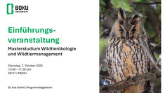 Einführungsveranstaltung Masterstudium Wildtierökologie und Wildtiermanagement Diese Seite ist erreichbar unter: https://boku.ac.at/oekb/wild/newsitem/86689 Dienstag, 7. Oktober 2025, 10:00 – 11:30 Uhr, SR 01 / MENH vergrößern 25.09.2025