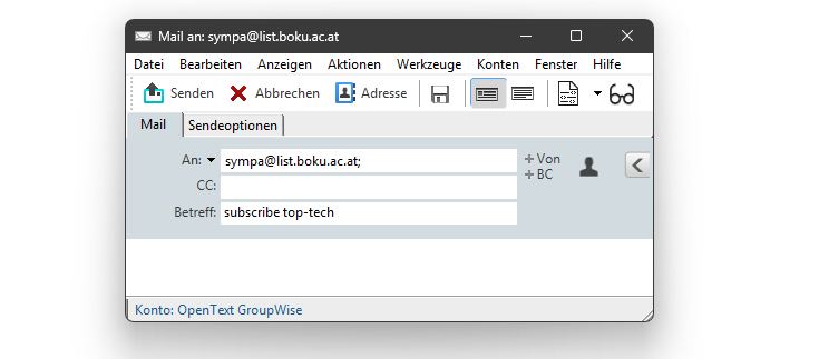 Falls GroupWise korrekt eingerichtet ist sollte sich in GroupWise ein neues Mail mit dem richtigen Betreff beim Klick auf folgenden Link öffnen: Mailingliste “top-tech” subskribieren