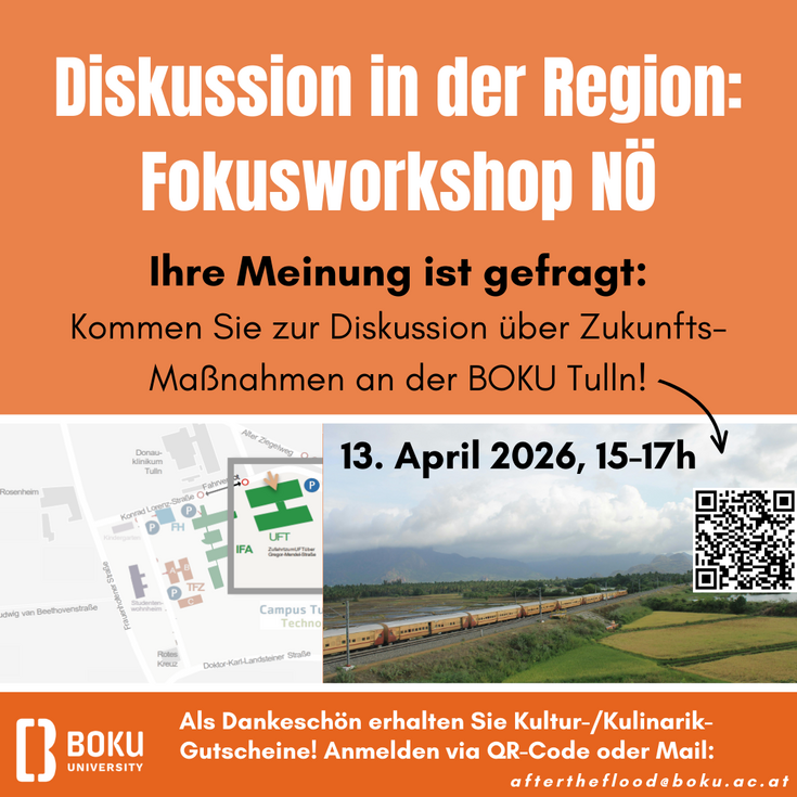 Im Rahmen eines aktuellen BOKU-Forschungsprojektes über Maßnahmendiskurse suchen wir Niederösterreicher*innen aus Hochwassergebieten. Eure Eindrücke über den Diskurs in Ihrer Region nach dem Extremwetterereignis sind wertvolle Informationen für regionale Forschung und Zukunfts-Maßnahmenempfehlungen. Als Dankeschön gibt es Kultur-/Kulinarik-Gutscheine. Melde dich hier über die Website an und teile deine Meinung mit uns! Gerne auch an niederösterreichische Bekannte weiterleiten!