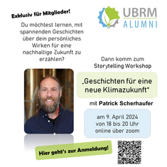 Exklusiv für Mitglieder des UBRM-Alumni-Vereins bieten wir am 09.04.2024 von 18 bis 20 Uhr einen Online Storytelling Workshop zum Thema "Geschichten für eine neue Klimazukunft". Der interaktive Workshop wird vom BOKU-Lehrenden Patrick Scherhaufer geleitet: