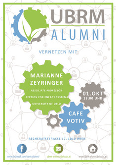 Unser nächstes Netzwerktreffen findet am 01. Oktober ab 18 Uhr statt, als Location haben wir das Cafe Votiv (Reichsratsstraße 17, 1010 Wien) gewählt. Als Gast dürfen wir diesmal Marianne Zeyringer begrüßen: Marianne hat den Bachelor Umwelt- und Bioressourcenmanagement abgeschlossen (2005-2008) und Sozioökonomie an der WU studiert. Während des UBRM Studiums absolvierte sie einen Erasmus Aufenthalt in Guadeloupe. Danach studierte Marianne „Environmental Technology and International Affairs“ an der Diplomatischen Akademie / TU Wien. Sie hat ein Cotutuelle-Doktorat (~ Zulassung & Forschung an zwei Universitäten gleichzeitig) in Energiesystemmodellierung von der Universität Utrecht (Prof. Ernst Worrell) und BOKU (Prof. Erwin Schmid und Johannes Schmidt).